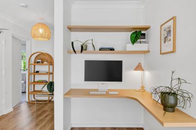 - Open plan living and dining space featuring a custom study nook and access to a sunny Juliet balcony